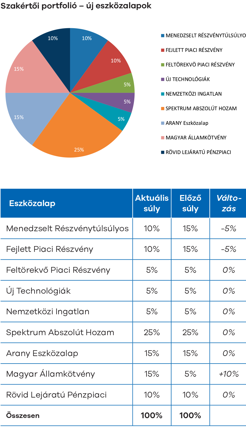 A várhatóan tetőző inflációs várakozások, illetve a kamatpolitika jövőbeni kilátásai alapján mindkét modellportfóliónk összetételében csökkentettük 5-5%-ponttal a Fejlett piaci részvény, és a Menedzselt részvénytúlsúlyos eszközalapok, illetve szintén 5-5%-ponttal a Globális részvény és a Növekedési eszközalapok súlyait, s ezzel egyidejűleg a Magyar államkötvény eszközalap súlyát 10-10%-ponttal növeltük meg.
