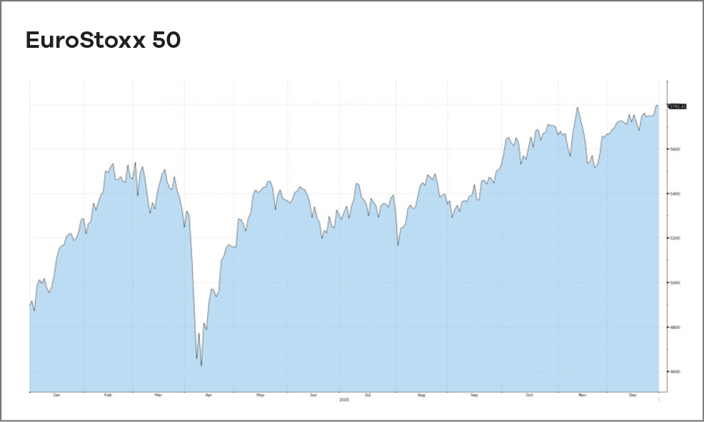 Európában a gazdasági növekedés továbbra is gyenge maradt, különösen Németországban, ahol az ipari termelés csak lassú stabilizálódás jeleit mutatja. A részvénypiacok ennek ellenére ellenállónak bizonyultak: a pénzügyi szektor és az energiaipari vállalatok év végén is támaszt nyújtottak az indexeknek. A hozamkörnyezet javulása összességében kedvezően hatott az európai eszközökre.