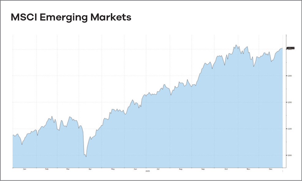 A fejlődő piacok decemberben vegyes képet mutattak. Latin-Amerikában a brazil piac év végén is erős maradt, amit az infláció további csökkenése és a stabil monetáris politika támogatott. Mexikó továbbra is profitál az amerikai gazdaság viszonylagos erejéből és a nearshoring trendből.