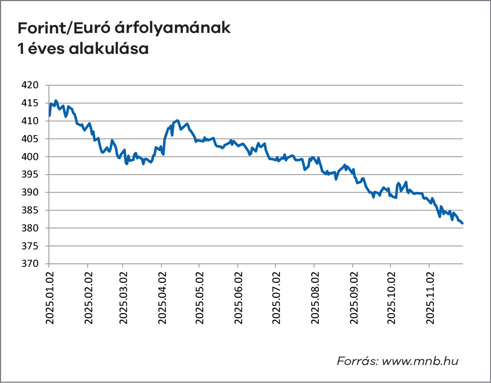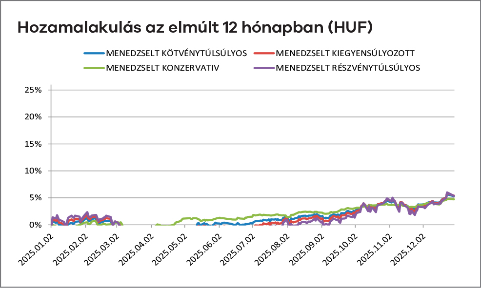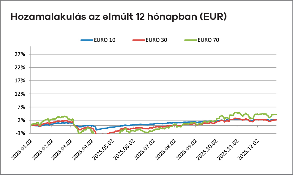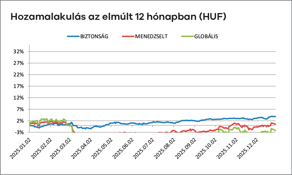 Magyarországon decemberben a forint enyhén erősödő pályán zárta az évet, az euró árfolyama jellemzően 385 környékén stabilizálódott. A hazai kötvénypiacon tovább folytatódott a hozamcsökkenés: a 10 éves állampapír hozama 7% alá süllyedt, ami érdemi támogatást nyújtott a kötvényalapok teljesítményének. A BUX index új történelmi csúcs közelében zárta az évet, elsősorban az OTP és a MOL részvényeinek év végi felülteljesítése miatt. Az infláció éves átlagban 4% körül alakult, míg a költségvetési hiány 2025-ben várhatóan GDP-arányosan 5% körüli szinten zárta az évet.