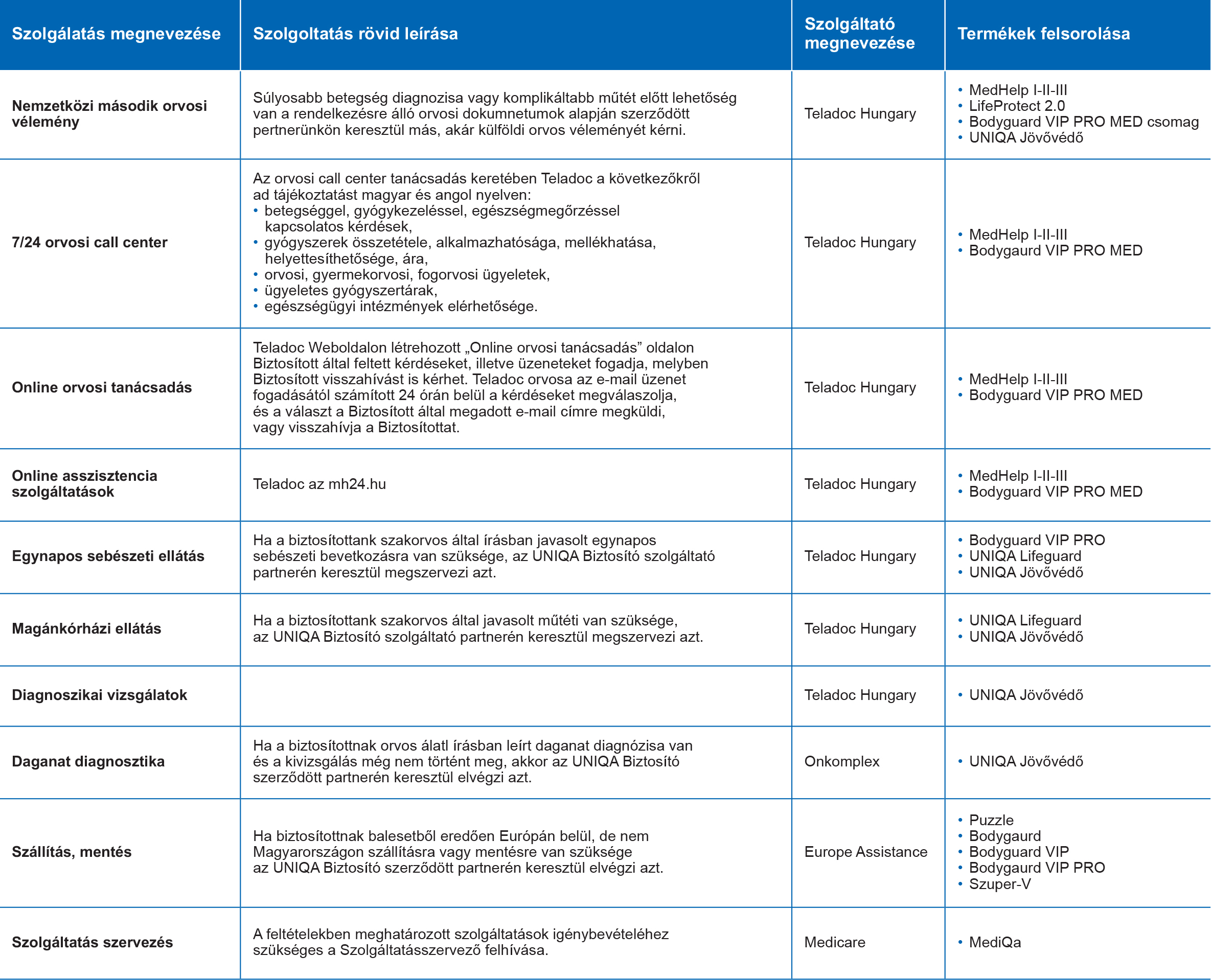 Élet- és személybiztosítások szolgáltatási lista