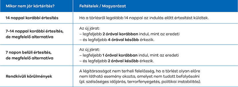 rendkívüli körülmények, például rossz időjárás, biztonsági kockázatok (terrortámadások, fenyegetések), vagy politikai instabilitás (háborús helyzet, zavargások). Ezekben az esetekben a légitársaságnak bizonyítania kell, hogy a törlés oka valóban rendkívüli körülmény volt, és minden ésszerű intézkedést megtett annak elkerülésére.
